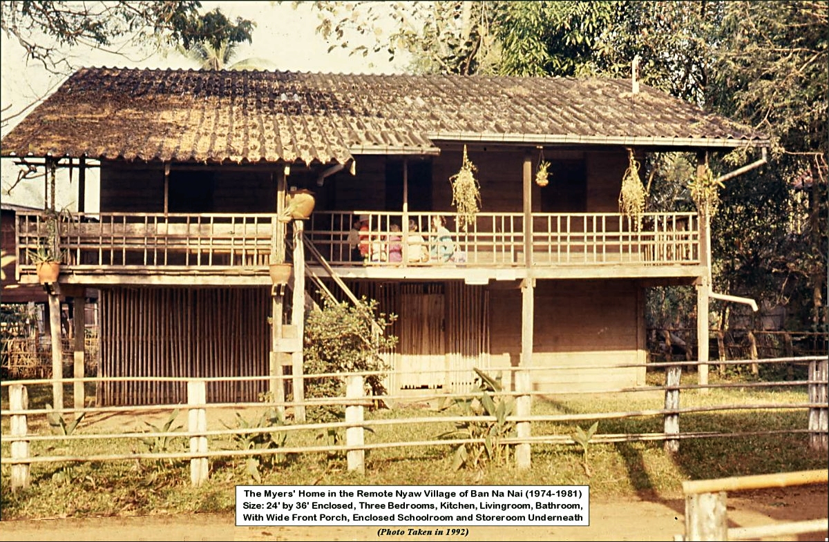 Ron and another missionary then conducted an extensive survey of the area on motorcycles, looking for a medium-sized Nyaw village that would invite them in to live. Locating one in the District of Tah-U-Tane, Ron spotted and leased an ideal plot of land on the edge of the village—the owner later being the first to receive Christ. Ron then located and purchased a substantial amount of good used lumber, and set about building their home. The Myers moved into their newly-constructed 36' by 24' cozy little home on the edge of that Nyaw village on Christmas Eve, 1974.