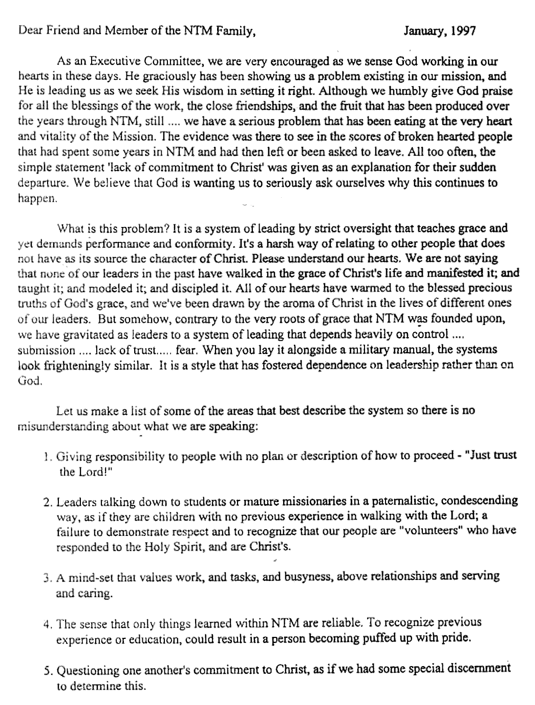 Unedited Memo From The NTM Executive Committee To All NTM Missionaries--1997