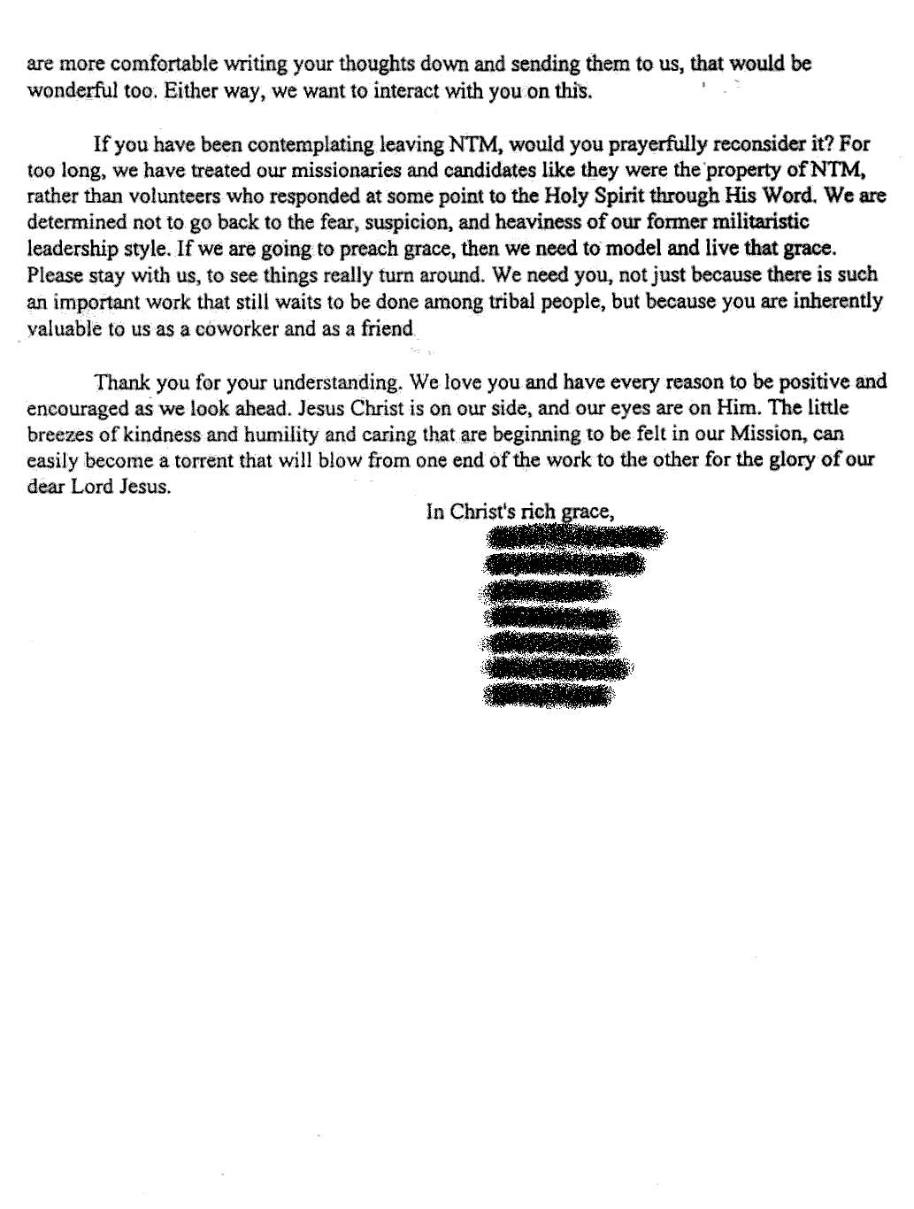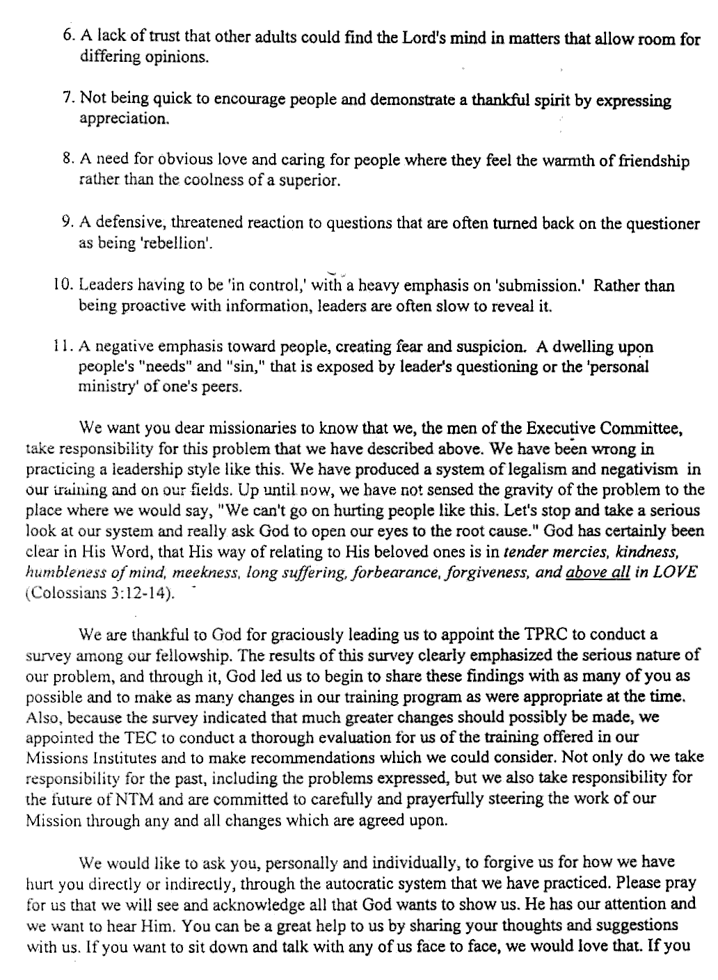 UNBELIEVABLE, YET TRUE: Who on the outside, in their right mind--be it supporting churches or individuals--would ever believe accounts like this told to them by a disgruntled or hurting missionary over the official letters of a large well-known mission organization? ...not many, except for possibly a few wise battle-scarred pastors or fellow missionaries who had personal experience under the gun. Despite these severe trials, I did not quit serving God (even though He and I had some very frank talks about a few things). Those were hard times, but God showed Himself strong on our behalf, and never let us down--something I could not honestly say about the mission organization that I admired, and had just sacrificially given some of the best, most productive years of my life (which I finally came to realize went pretty-much unappreciated). I need to interject here that no missionary that I know of who served faithfully under NTM, and later resigned, ever received a voluntarily-written letter of thanks, appreciation, or recommendation--this in stark contrast to the pleasant letter of thanks I had receive from another mission organization. It's just not in them as an organization to compliment anyone, either within the mission or leaving the mission, be it on paper or verbally. Negative-sounding letters? Yes! Positive-sounding letters? Rare. I've no clue as to why, other than it's general policy and part of their accepted "corporate culture." I now understand that much of their external negativity has now subsided, as a result of their having been threatened or faced with liable suits. A NEW DAY DAWNING--REASONS FOR NTM'S CONCILIATORY-SOUNDING MEMO: A few years later (note the 1997 date of the memo), these unchecked mission-wide leadership-structure problems finally came to a head, and thus to light. Hence, the NTM Executive Committee (EC) was forced to admit and deal with their mistakes, mistakes that they claimed had "just recently been brought to their attention." Actually, these very serious problems were long-standing, brought about and exacerbated by their own on-going autocratic management style--executed both passively and actively over the years on NTM missionaries. In short, anyone who found themselves caught in the cog wheels of the NTM bureaucratic machine, for whatever reason, was in danger of being treated pretty much the same, be it candidates or productive veteran missionaries alike.